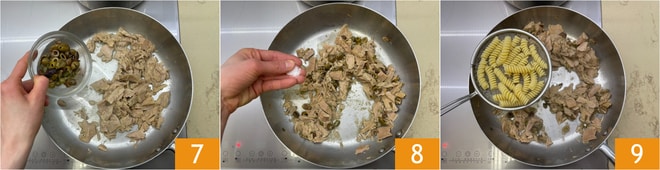 Ajoutez les câpres et les olives 7, rectifiez l'assaisonnement en sel 8 et mélangez pour amalgamer les ingrédients. Égouttez les pâtes directement dans la poêle 9.