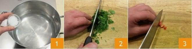 Pour préparer les pâtes à la carrettiera, versez l'eau dans une grande casserole, salez à votre goût et portez à ébullition 1. Ensuite, hachez un bouquet de persil 2 et le piment frais 3.