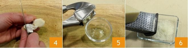 Épluchez la gousse d'ail 4, éliminez le germe vert à l'intérieur et hachez-la 5 ; puis râpez le Pecorino 6.