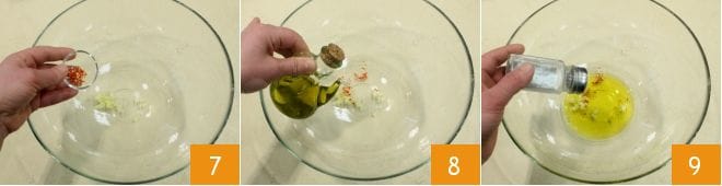 Dans un grand bol, versez l'ail et le piment hachés 7, une bonne quantité d'huile d'olive 8 et salez à votre goût.