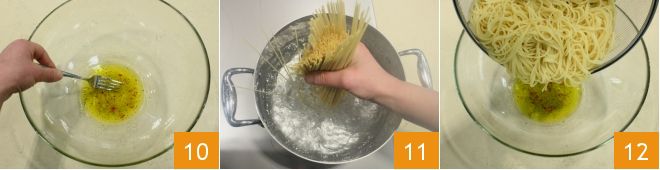 Mélangez l'émulsion avec une fourchette 10. Pendant ce temps, lorsque l'eau bout, faites cuire les spaghettis 11, puis égouttez-les al dente, en conservant l'eau de cuisson, et remettez-les dans le bol avec le mélange à base d'huile, d'ail et de piment 12.