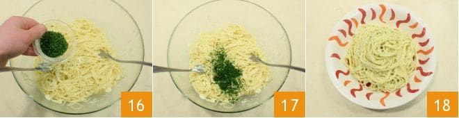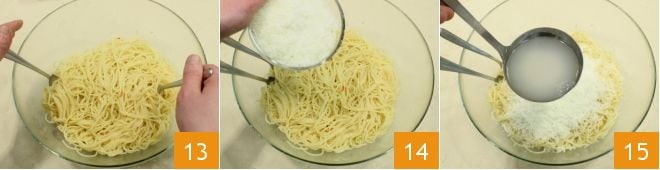 Mélangez rapidement les spaghettis 13 et ajoutez le Pecorino râpé 14 et une louche d'eau de cuisson 15.