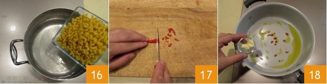 Faites cuire les pâtes dans une abondante eau bouillante, légèrement salée (étant donné que la sauce sera très savoureuse, grâce à la présence de la ricotta salée) 16. En attendant, incisez un piment frais, retirez les graines et émincez-le finement 17. Mettez dans une casserole l'huile avec l'ail, débarrassé de son germe, et le piment 18 et faites-les dorer à feu modéré, puis retirez l'ail.