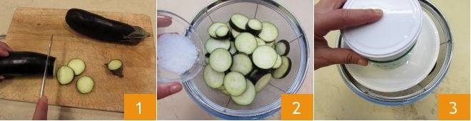Pour préparer la pasta alla Norma en blanc, commencez par nettoyer les aubergines. Lavez les aubergines, retirez les extrémités et coupez-les en tranches d'une épaisseur de 0,5 cm 1. Placez-les dans une passoire en les saupoudrant petit à petit de gros sel 2. Couvrez avec une assiette et placez un poids dessus 3 et laissez reposer les aubergines pendant 1-2 heures. De cette manière, elles élimineront l'excès de liquide et le goût amer.