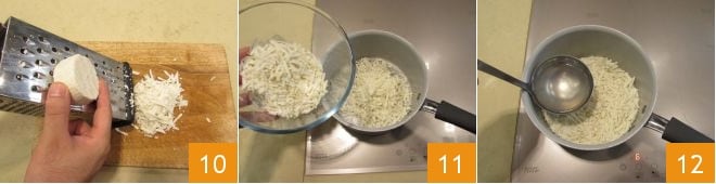 Consacrez-vous maintenant à la préparation de la crème de ricotta salée. Râpez la ricotta salée 10 et gardez-en environ 50 g de côté pour la décoration finale ; versez le reste dans une casserole 11. Ajoutez une louche d'eau chaude 12,