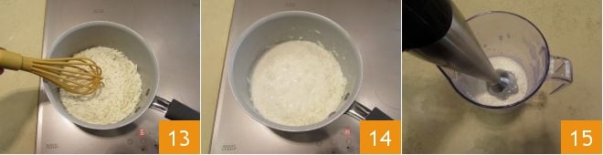 mélangez avec un fouet 13 et faites cuire environ 10 minutes, jusqu'à ce que la ricotta soit fondue 14. Puis versez la crème de ricotta salée dans un récipient à bords hauts et mixez-la avec un mixeur plongeant 15, jusqu'à obtenir une sauce lisse et homogène.