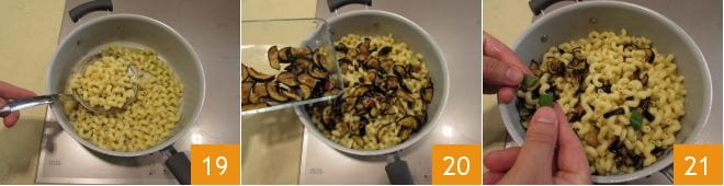 Égouttez les pâtes al dente et ajoutez-les dans la casserole avec l'huile et le piment 19, ajoutez également les lanières d'aubergines 20 et les feuilles de basilic déchirées à la main 21.