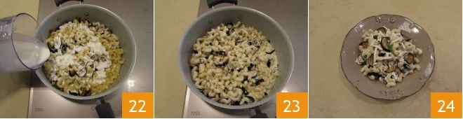 Versez la crème de ricotta salée 22 et mélangez pour amalgamer tous les ingrédients 23. Servez et décorez votre pasta alla Norma en blanc avec les copeaux de ricotta salée mis de côté et quelques feuilles de basilic 24.