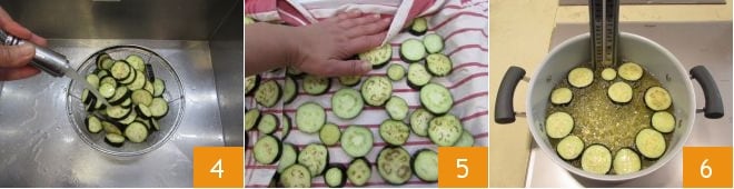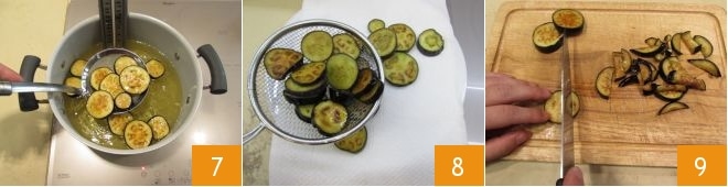 Après ce temps, rincez-les sous abondante eau courante 4 et tamponnez-les avec un torchon propre et sec 5. Mettez l'huile de graines dans une casserole à bords hauts et portez-la à une température de 170° (utilisez un thermomètre de cuisine pour atteindre la bonne température) et plongez-y quelques tranches d'aubergines à la fois 6, afin de ne pas abaisser la température de l'huile.
