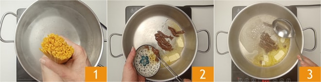 Pour préparer les pâtes au beurre et aux anchois, commencez par cuire les pâtes dans de l'eau bouillante salée 1. Dans une casserole, mettez 60 g de beurre, ajoutez 60 g d'anchois 2 et une louche d'eau de cuisson des pâtes 3. Faites fondre le beurre et les anchois à feu doux.