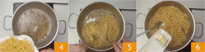 Une fois les pâtes cuites, égouttez-les, mais gardez l'eau de cuisson, et transférez-les dans la casserole avec le beurre et les anchois 4. Mélangez bien 5, pour que la sauce enrobe les pâtes. Éteignez le feu et ajoutez le reste du beurre 6.
