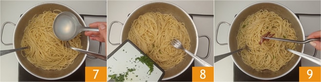 Ajoutez également une louche d'eau de cuisson des pâtes 7 et mélangez. Ajoutez le persil finement haché 8 et les filets d'anchois restants 9. Dressez et terminez avec une cuillerée de sauce qui restera au fond de la casserole. Vos pâtes au beurre et aux anchois sont prêtes à être dégustées !