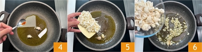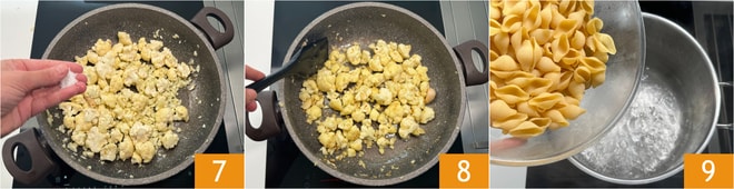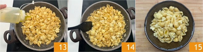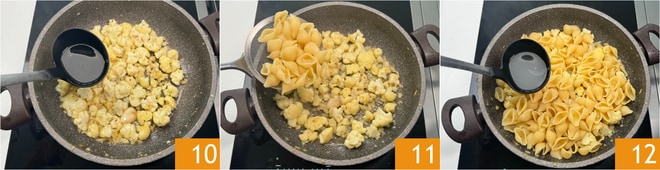 À ce stade, retirez l'ail et déglacez le chou-fleur avec une louche d'eau de cuisson des pâtes 10, puis baissez le feu. Égouttez les pâtes très al dente directement dans la poêle 11 et terminez la cuisson en ajoutant plus d'eau de cuisson 12.