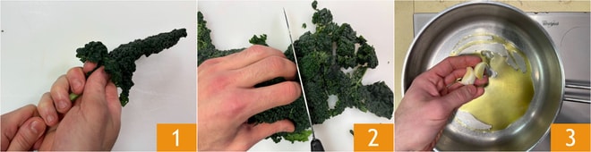 Pour préparer les pâtes à la crème de chou noir, joue de porc et pecorino, commencez par nettoyer le chou noir : éliminez les côtes centrales 1 et coupez grossièrement les feuilles 2. Dans une poêle, versez l'huile et ajoutez les gousses d'ail en chemise 3.