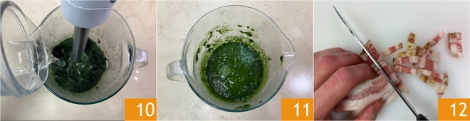 Ajoutez un peu d'eau 10 et mixez jusqu'à obtenir une crème lisse et homogène 11. Réservez la crème et coupez la joue de porc en lanières, après avoir retiré la couenne 12.