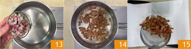 Nettoyez la poêle où vous avez cuit le chou noir et chauffez-la bien, puis ajoutez la joue de porc 13. Faites cuire à feu moyen pendant 5-7 minutes, jusqu'à ce que la joue de porc soit devenue croustillante 14. Transférez-la sur du papier absorbant 15.