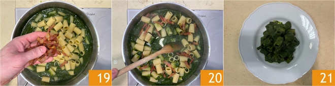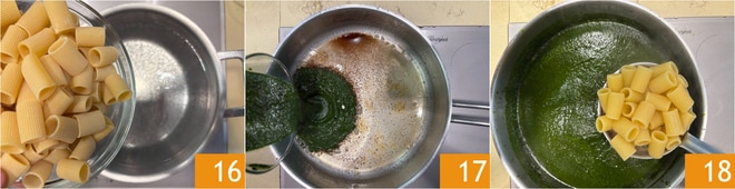 Entre-temps, faites cuire les pâtes dans une grande quantité d'eau bouillante salée 16. Versez la crème de chou noir dans la même poêle où vous avez cuit la joue de porc 17. Égouttez les pâtes al dente et transférez-les dans la poêle 18.
