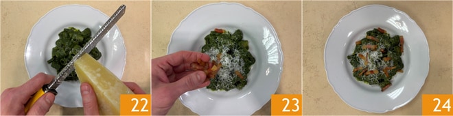 Complétez avec une pincée de pecorino râpé 22 et le reste de la joue de porc croustillante 23. Les pâtes à la crème de chou noir, joue de porc et pecorino sont prêtes à être servies 24 !