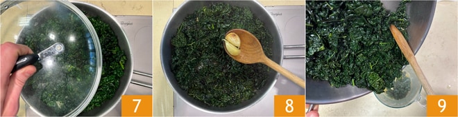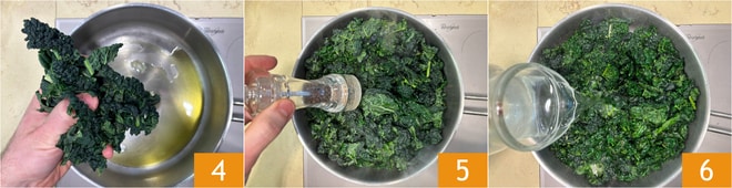 Ajoutez le chou noir 4 et ajustez le sel et le poivre 5. Cuisez pendant 5-7 minutes, en remuant de temps en temps, jusqu'à ce que le chou soit flétri. À ce stade, ajoutez un filet d'eau 6.