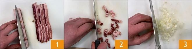 Pour préparer les pâtes à la pancetta, commencez par couper la pancetta d'abord en tranches 1, puis en lanières et enfin en dés 2. Nettoyez et hachez l'oignon 3.