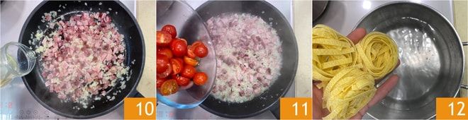 Déglacez avec le vin blanc 10 et laissez évaporer complètement, puis ajoutez les tomates cerises 11 et cuisez à feu moyen pendant une dizaine de minutes. Pendant ce temps, portez à ébullition une casserole d'eau salée et plongez-y les tagliatelles 12.