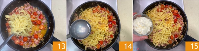 Égouttez les pâtes directement dans la sauce 13 et mélangez le tout dans la poêle en ajoutant une louche d'eau de cuisson si nécessaire 14. Assaisonnez avec le parmesan râpé 15.