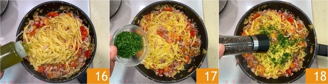 Versez un filet d'huile 16, puis aromatisez avec le persil haché 17 et un tour de moulin à poivre 18. Mélangez bien le tout et éteignez le feu.