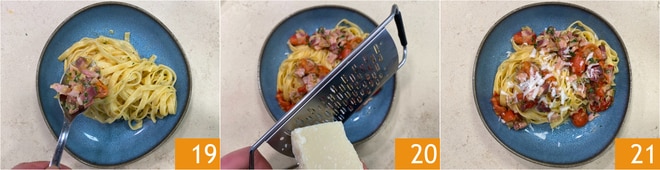 Servez dans une assiette 19 et complétez avec du pecorino râpé 20. Vos pâtes à la pancetta sont prêtes à être servies 21!