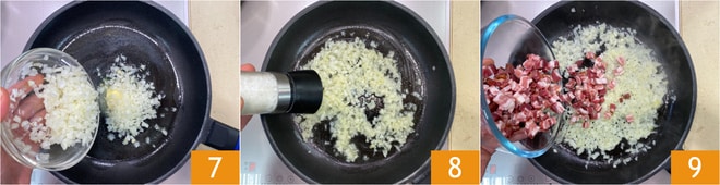 Ajoutez l'oignon 7, salez 8 et laissez mijoter, puis ajoutez la pancetta 9 et faites-la revenir quelques minutes.