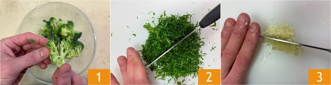 Pour préparer les pâtes au poulet et brocoli, commencez par préparer le Bouillon de poule (ou poulet) en suivant notre recette et gardez-le au chaud. Lavez les brocolis, détachez les florettes 1 et réservez. Hachez le persil 2 et l'ail 3.