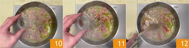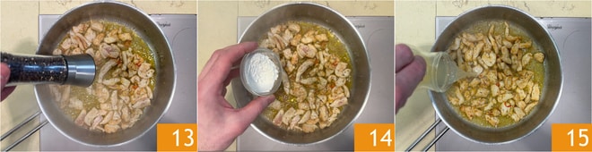 Assaisonnez avec du sel et du poivre 13. Ajoutez ensuite la farine 14 et déglacez avec le vin blanc 15. Lorsque toute la partie alcoolique s'est évaporée, versez le bouillon de poulet dans la poêle.