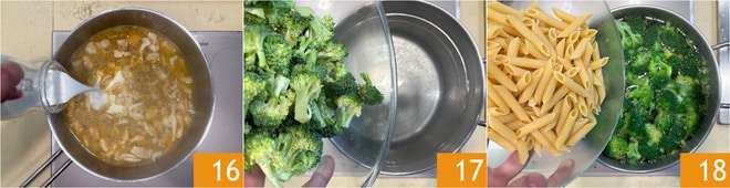 Ajoutez la crème 16 et faites cuire à feu doux pendant 5 minutes. Entre-temps, faites cuire les brocolis dans de l'eau bouillante salée 17 pendant 2 minutes, puis ajoutez les pâtes 18 et faites cuire selon le temps indiqué sur l'emballage.