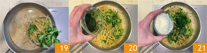 Égouttez les pâtes et les brocolis directement dans la sauce 19 et éteignez le feu. Ajoutez le persil haché 20 et le parmesan râpé 21.