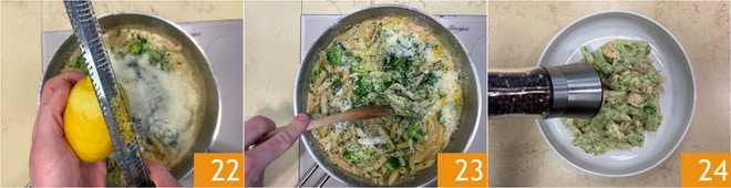 Ajoutez également le zeste de citron 22 et mélangez pendant quelques minutes 23, juste le temps d'amalgamer les ingrédients. Dressez et complétez avec une pincée de poivre noir 24.