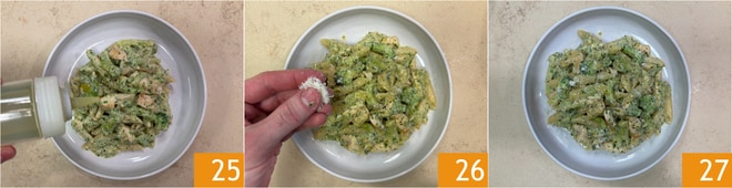 Terminez par un filet d'huile à cru 25 et une pincée de parmesan râpé 26. Vos pâtes au poulet et brocoli sont prêtes à être dégustées 27.