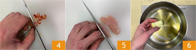 Coupez le piment frais en rondelles 4 et le poulet en lamelles 5. Dans une poêle, versez un filet d'huile, ajoutez le beurre 6 et faites-le fondre à feu moyen.