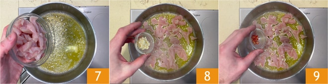 Ajoutez le poulet 7, l'ail 8 et le piment 9.