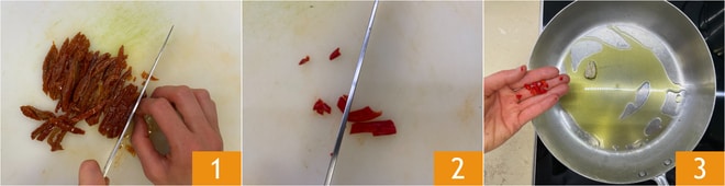 Pour préparer les pâtes aux tomates séchées, commencez par couper les tomates séchées en lanières 1. Enlevez les graines du piment et coupez-le en petits morceaux 2. Dans une poêle, versez l'huile, l'ail en chemise écrasé et le piment 3 et faites revenir quelques minutes.