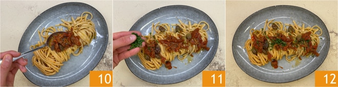 Dressez les assiettes, assaisonnez avec la sauce 10 et complétez avec un peu plus de persil haché 11. Vos pâtes aux tomates séchées sont prêtes à être dégustées 12!