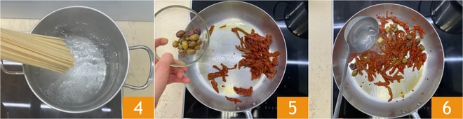 Entre-temps, faites cuire les pâtes dans une grande quantité d'eau salée 4. Ajoutez dans la poêle les tomates séchées et les olives taggiasches 5. Versez une louche d'eau de cuisson des pâtes 6 et faites cuire à feu doux pendant le temps de cuisson des pâtes.