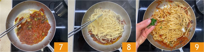 Enlevez l'ail 7 et égouttez les pâtes directement dans la poêle 8. Ajoutez le persil haché 9 et mélangez.
