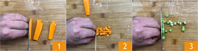 Pour préparer les pâtes et haricots en conserve, commencez par vous occuper des légumes. Coupez les carottes d'abord en tranches 1 puis en dés de 1 cm 2. Faites de même pour le céleri 3.