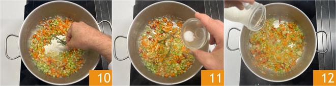 Ajoutez le romarin 10, salez 11 et faites cuire à feu moyen pendant 5 minutes. Pendant ce temps, mettez sur le feu une casserole pleine d'eau. Déglacez avec du vin blanc 12 et laissez évaporer toute la partie alcoolique.