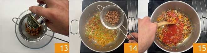 Entre-temps, ouvrez la boîte de haricots et égouttez-les 13, rincez-les pour éliminer complètement l'eau de conservation. Mettez les haricots dans la casserole 14 et laissez cuire pendant 5 minutes en mélangeant bien. Enlevez l'ail et le romarin, puis versez la purée de tomates dans la casserole 15.