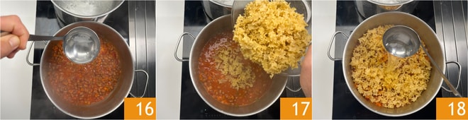 Laissez cuire pendant 20 minutes en ajoutant de l'eau chaude 16 pour éviter qu'elle ne se dessèche trop. Ajoutez les pâtes crues 17 et ajoutez de l'eau chaude 18 jusqu'à les recouvrir complètement. Faites cuire les pâtes en ajoutant de l'eau chaude quand nécessaire et en remuant de temps en temps.