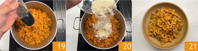 À la fin de la cuisson, rectifiez l'assaisonnement en sel et éteignez le feu. Ajoutez une pincée de poivre 19, le pecorino romano 20 et mélangez. Vos pâtes et haricots en conserve sont prêtes à être dégustées 21.