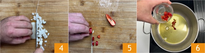 Coupez l'oignon en dés de 0,5 cm 4. Émincez finement le piment 5. Dans une casserole, chauffez l'huile et ajoutez l'ail coupé en deux et le piment 6. Faites revenir pendant 1 minute à feu moyen.