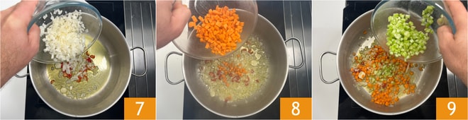 Ajoutez l'oignon 7, les carottes 8 et le céleri 9.