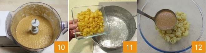 Mélangez encore quelques secondes jusqu'à obtenir un mélange lisse et homogène 10. Puis, laissez le gaspacho reposer pendant quelques heures. Pendant ce temps, faites cuire les pipes rigate dans une casserole avec de l'eau bouillante salée selon votre goût 11. Ensuite, égouttez-les al dente et refroidissez les pâtes sous l'eau froide courante. Après cela, égouttez-les bien et transférez-les dans un grand bol, versez une partie du gaspacho pour assaisonner les pâtes 12.