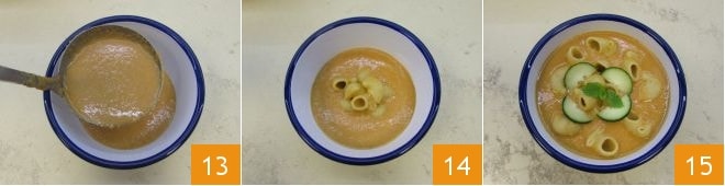 Divisez le reste du gaspacho dans les assiettes de service 13 et versez-y les pipes rigate assaisonnées 14 ; vous pouvez décorer chaque assiette avec des tranches de concombre et du basilic si vous le souhaitez. Vos pâtes froides au gaspacho sont prêtes à être servies.